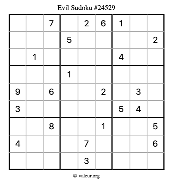Here is our printable Evil Sudoku Puzzle #24529. You are welcome to print a copy for yourself and solve it the old-fashioned way with a pencil and an eraser!