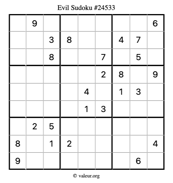 Evil Sudoku puzzle #24533 is not the only evil Sudoku puzzle in our database. We have thousands of evil Sudoku puzzles that you can print and solve. Check them out here!