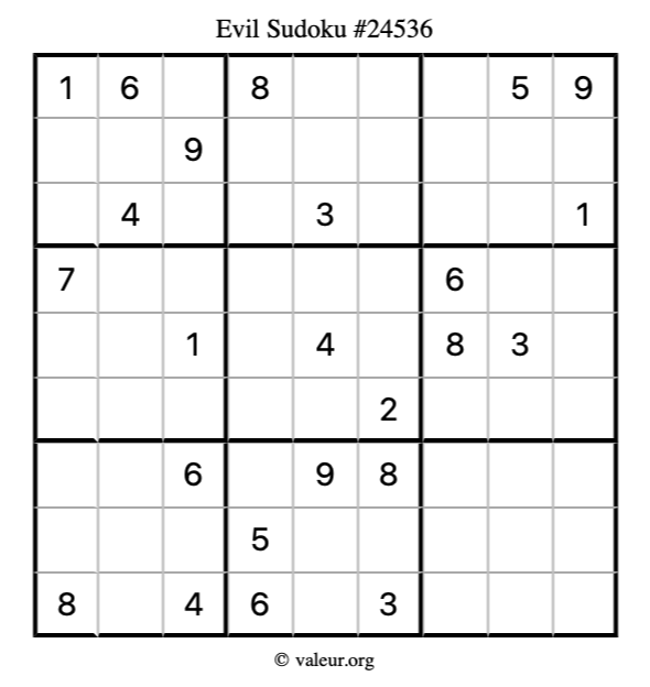 Evil Sudoku puzzle #24536 is not the only evil Sudoku puzzle in our database. We have thousands of evil Sudoku puzzles that you can print and solve. Check them out here!