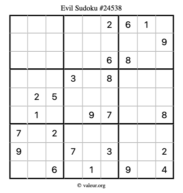 Here is our printable Evil Sudoku Puzzle #24538. You are welcome to print a copy for yourself and solve it the old-fashioned way with a pencil and an eraser!
