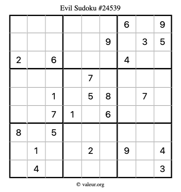 Here is our printable Evil Sudoku Puzzle #24539. You are welcome to print a copy for yourself and solve it the old-fashioned way with a pencil and an eraser!