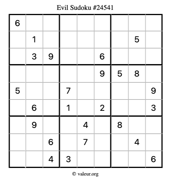 Here is our printable Evil Sudoku Puzzle #24541. You are welcome to print a copy for yourself and solve it the old-fashioned way with a pencil and an eraser!