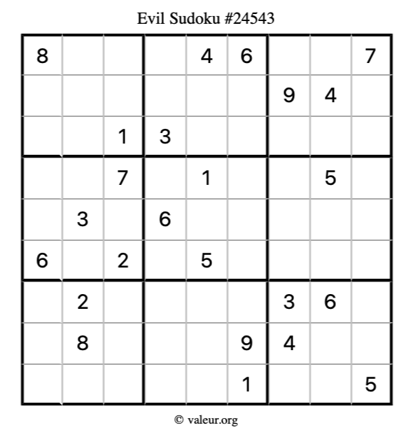 Here is our printable Evil Sudoku Puzzle #24543. You are welcome to print a copy for yourself and solve it the old-fashioned way with a pencil and an eraser!