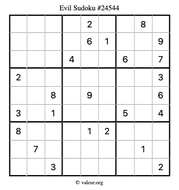 Here is our printable Evil Sudoku Puzzle #24544. You are welcome to print a copy for yourself and solve it the old-fashioned way with a pencil and an eraser!