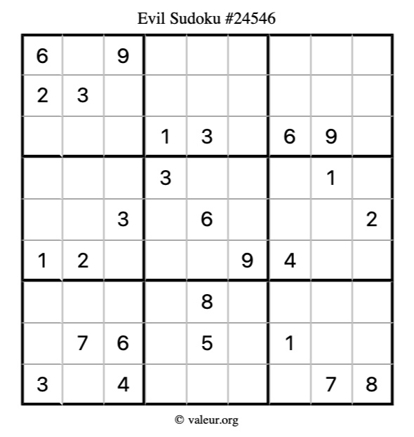 Here is our printable Evil Sudoku Puzzle #24546. You are welcome to print a copy for yourself and solve it the old-fashioned way with a pencil and an eraser!