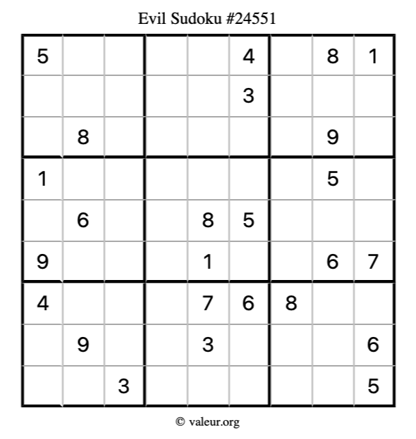 Here is our printable Evil Sudoku Puzzle #24551. You are welcome to print a copy for yourself and solve it the old-fashioned way with a pencil and an eraser!
