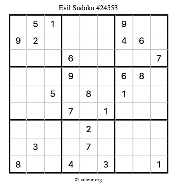 Here is our printable Evil Sudoku Puzzle #24553. You are welcome to print a copy for yourself and solve it the old-fashioned way with a pencil and an eraser!