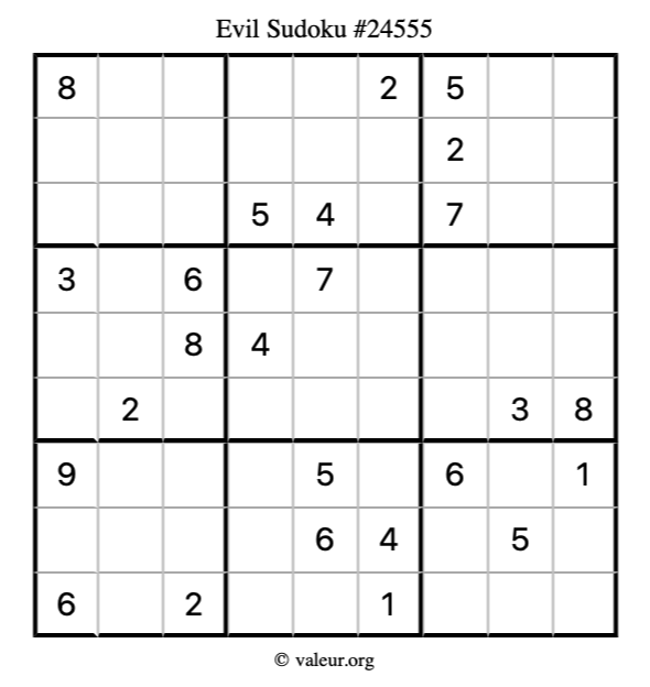 Here is our printable Evil Sudoku Puzzle #24555. You are welcome to print a copy for yourself and solve it the old-fashioned way with a pencil and an eraser!