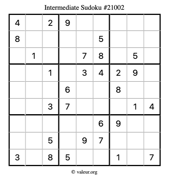 Here is our printable Intermediate Sudoku Puzzle #21002. You are welcome to print a copy for yourself and solve it the old-fashioned way with a pencil and an eraser!