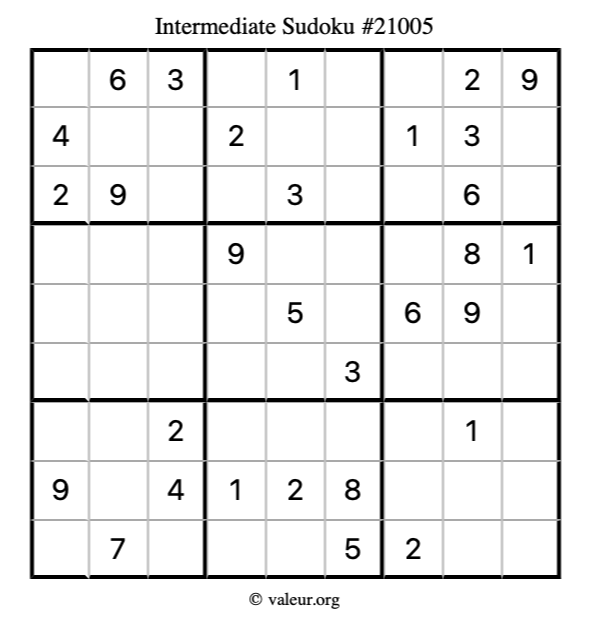 Here is our printable Intermediate Sudoku Puzzle #21005. You are welcome to print a copy for yourself and solve it the old-fashioned way with a pencil and an eraser!