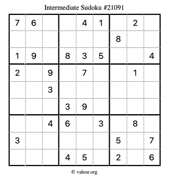 Here is our printable Intermediate Sudoku Puzzle #21091. You are welcome to print a copy for yourself and solve it the old-fashioned way with a pencil and an eraser!