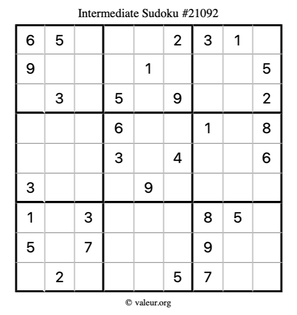 Here is our printable Intermediate Sudoku Puzzle #21092. You are welcome to print a copy for yourself and solve it the old-fashioned way with a pencil and an eraser!