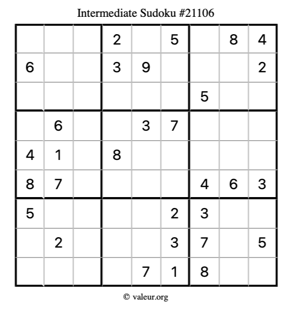 Here is our printable Intermediate Sudoku Puzzle #21106. You are welcome to print a copy for yourself and solve it the old-fashioned way with a pencil and an eraser!