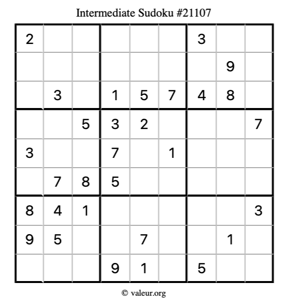 Here is our printable Intermediate Sudoku Puzzle #21107. You are welcome to print a copy for yourself and solve it the old-fashioned way with a pencil and an eraser!