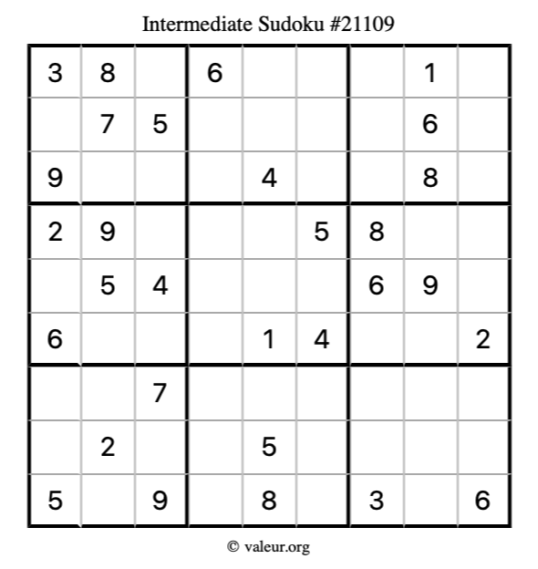 Here is our printable Intermediate Sudoku Puzzle #21109. You are welcome to print a copy for yourself and solve it the old-fashioned way with a pencil and an eraser!