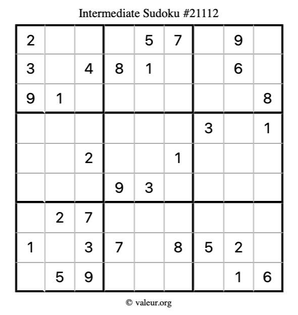 Here is our printable Intermediate Sudoku Puzzle #21112. You are welcome to print a copy for yourself and solve it the old-fashioned way with a pencil and an eraser!