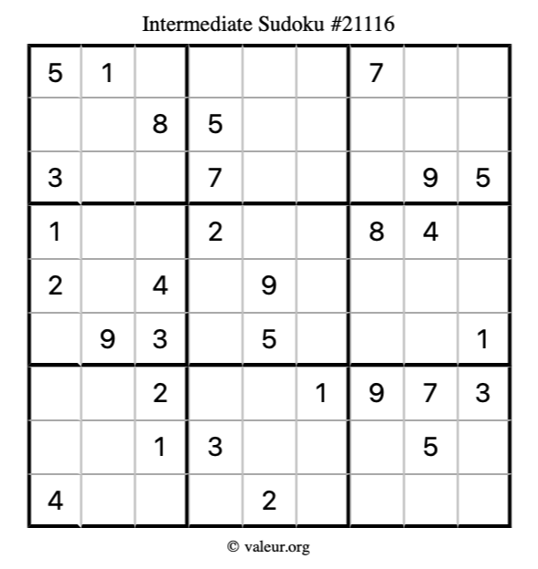Here is our printable Intermediate Sudoku Puzzle #21116. You are welcome to print a copy for yourself and solve it the old-fashioned way with a pencil and an eraser!