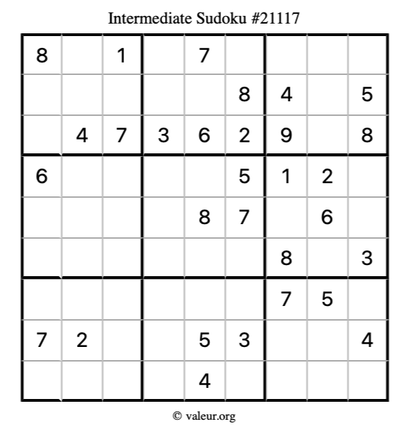 Here is our printable Intermediate Sudoku Puzzle #21117. You are welcome to print a copy for yourself and solve it the old-fashioned way with a pencil and an eraser!