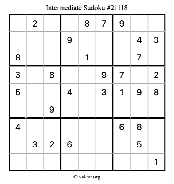 Here is our printable Intermediate Sudoku Puzzle #21118. You are welcome to print a copy for yourself and solve it the old-fashioned way with a pencil and an eraser!