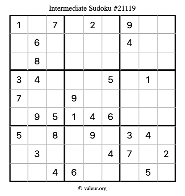 Here is our printable Intermediate Sudoku Puzzle #21119. You are welcome to print a copy for yourself and solve it the old-fashioned way with a pencil and an eraser!