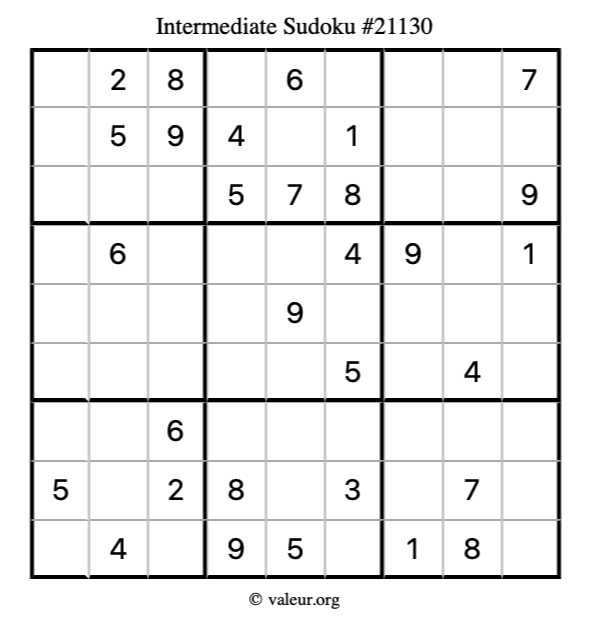 Here is our printable Intermediate Sudoku Puzzle #21130. You are welcome to print a copy for yourself and solve it the old-fashioned way with a pencil and an eraser!