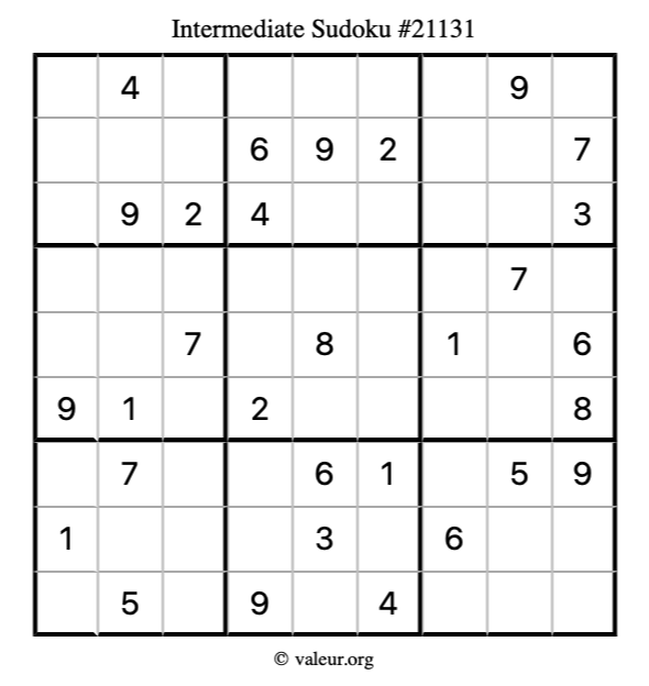 Here is our printable Intermediate Sudoku Puzzle #21131. You are welcome to print a copy for yourself and solve it the old-fashioned way with a pencil and an eraser!