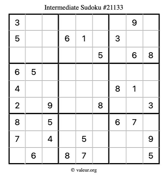 Here is our printable Intermediate Sudoku Puzzle #21133. You are welcome to print a copy for yourself and solve it the old-fashioned way with a pencil and an eraser!