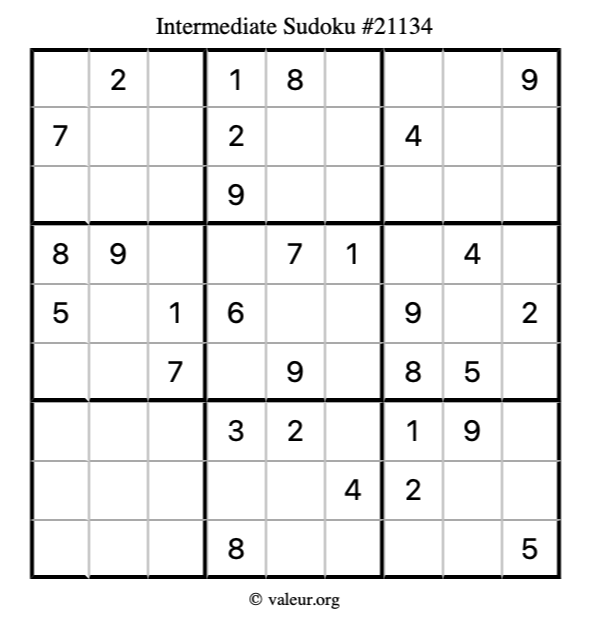 Here is our printable Intermediate Sudoku Puzzle #21134. You are welcome to print a copy for yourself and solve it the old-fashioned way with a pencil and an eraser!