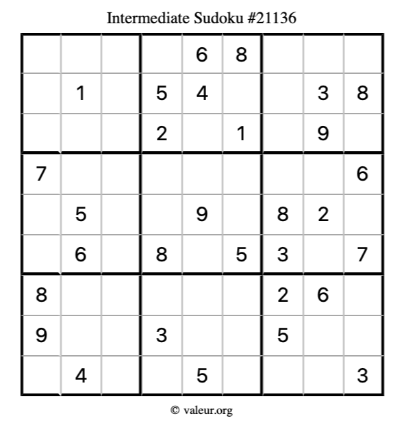 Here is our printable Intermediate Sudoku Puzzle #21136. You are welcome to print a copy for yourself and solve it the old-fashioned way with a pencil and an eraser!
