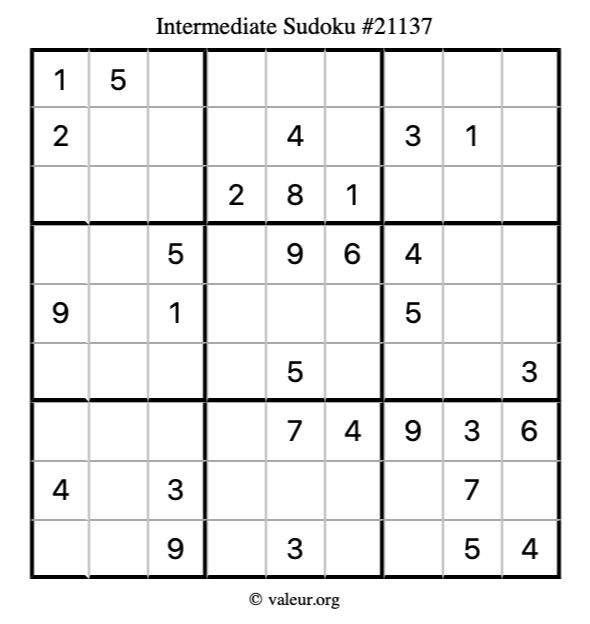 Here is our printable Intermediate Sudoku Puzzle #21137. You are welcome to print a copy for yourself and solve it the old-fashioned way with a pencil and an eraser!
