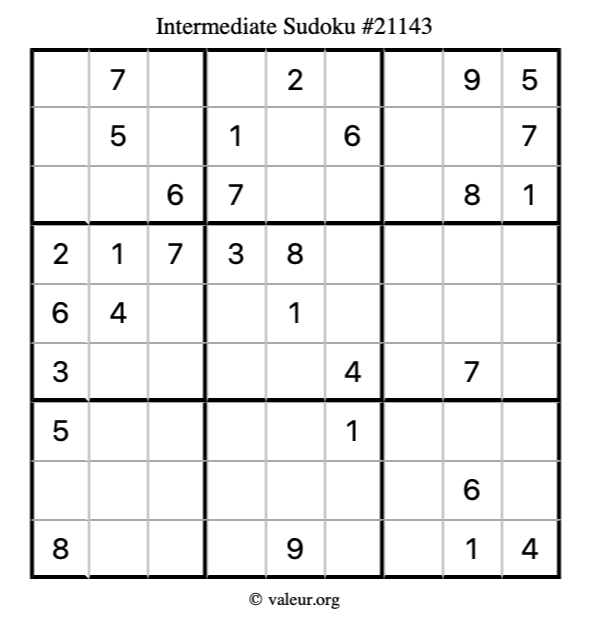 Here is our printable Intermediate Sudoku Puzzle #21143. You are welcome to print a copy for yourself and solve it the old-fashioned way with a pencil and an eraser!