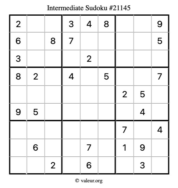 Here is our printable Intermediate Sudoku Puzzle #21145. You are welcome to print a copy for yourself and solve it the old-fashioned way with a pencil and an eraser!
