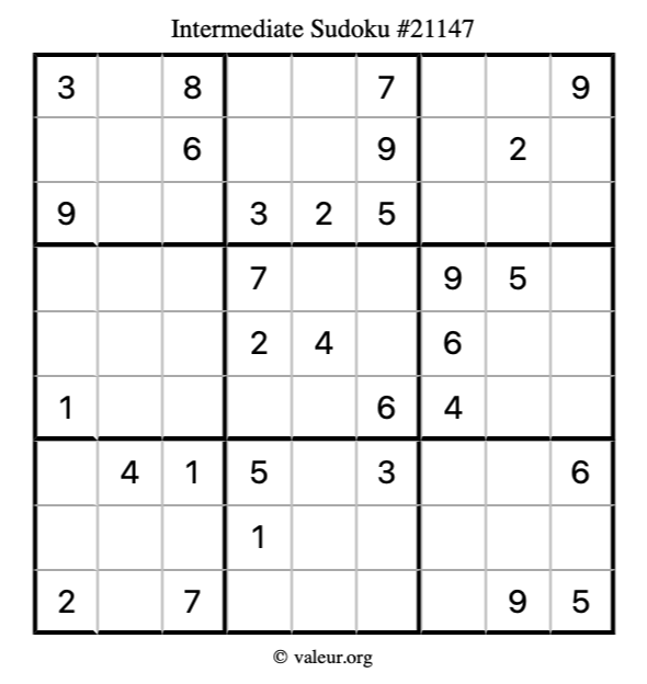 Here is our printable Intermediate Sudoku Puzzle #21147. You are welcome to print a copy for yourself and solve it the old-fashioned way with a pencil and an eraser!