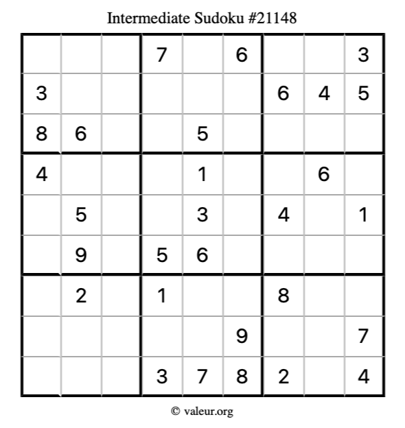 Here is our printable Intermediate Sudoku Puzzle #21148. You are welcome to print a copy for yourself and solve it the old-fashioned way with a pencil and an eraser!