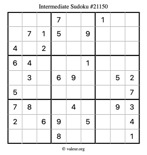 Here is our printable Intermediate Sudoku Puzzle #21150. You are welcome to print a copy for yourself and solve it the old-fashioned way with a pencil and an eraser!