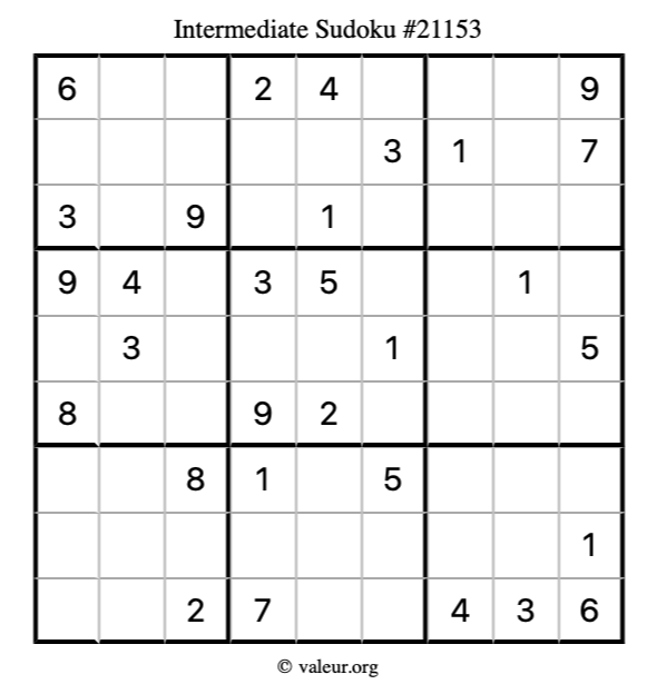 Here is our printable Intermediate Sudoku Puzzle #21153. You are welcome to print a copy for yourself and solve it the old-fashioned way with a pencil and an eraser!