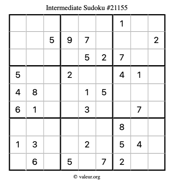 Here is our printable Intermediate Sudoku Puzzle #21155. You are welcome to print a copy for yourself and solve it the old-fashioned way with a pencil and an eraser!