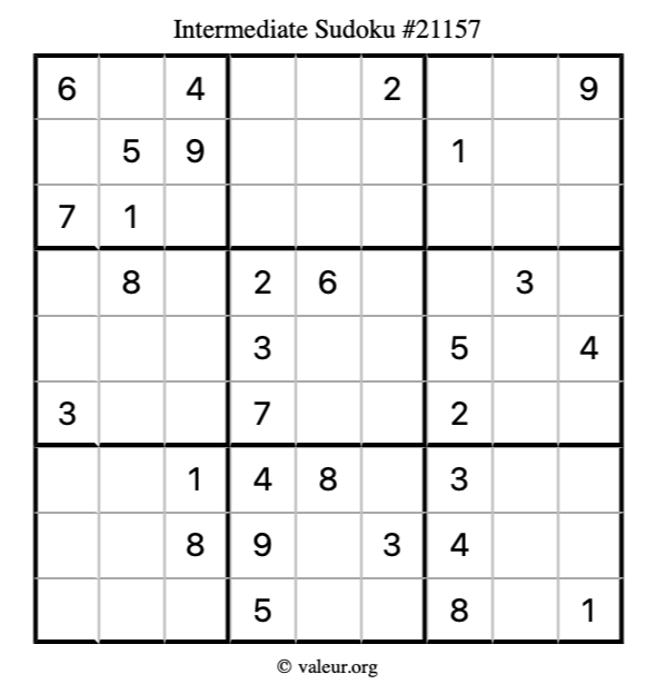 Here is our printable Intermediate Sudoku Puzzle #21157. You are welcome to print a copy for yourself and solve it the old-fashioned way with a pencil and an eraser!