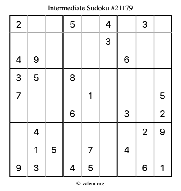 Here is our printable Intermediate Sudoku Puzzle #21179. You are welcome to print a copy for yourself and solve it the old-fashioned way with a pencil and an eraser!