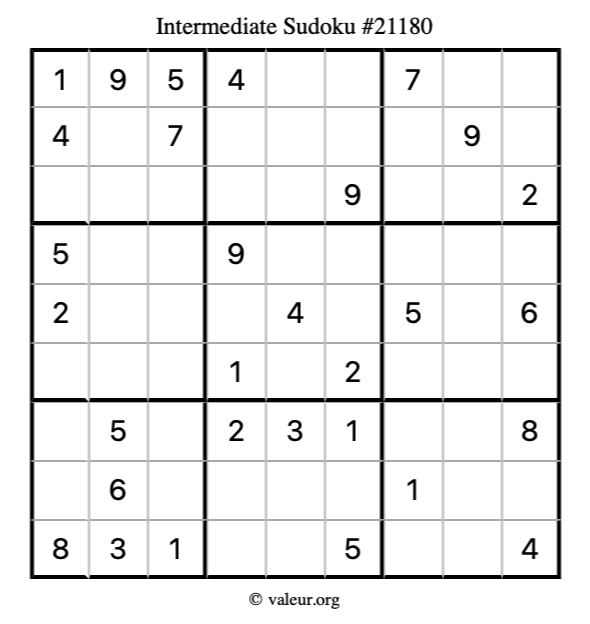 Here is our printable Intermediate Sudoku Puzzle #21180. You are welcome to print a copy for yourself and solve it the old-fashioned way with a pencil and an eraser!