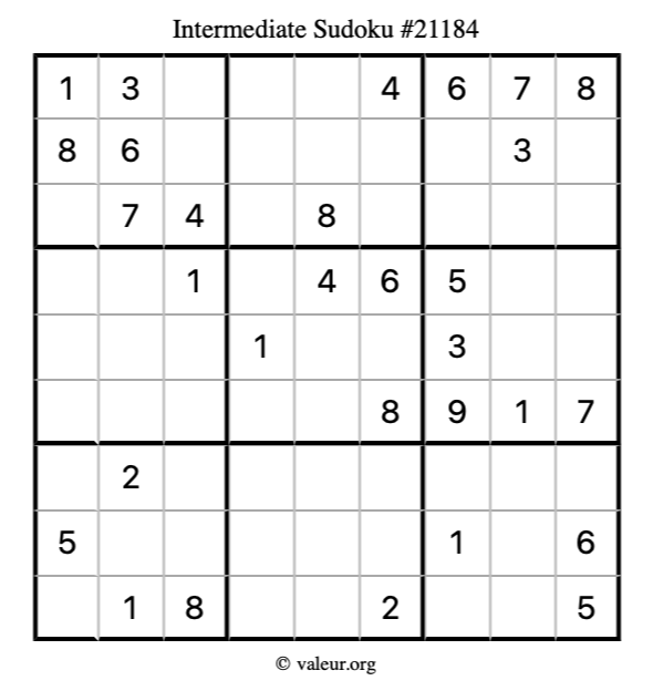 Here is our printable Intermediate Sudoku Puzzle #21184. You are welcome to print a copy for yourself and solve it the old-fashioned way with a pencil and an eraser!