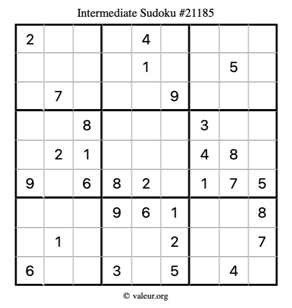 Here is our printable Intermediate Sudoku Puzzle #21185. You are welcome to print a copy for yourself and solve it the old-fashioned way with a pencil and an eraser!