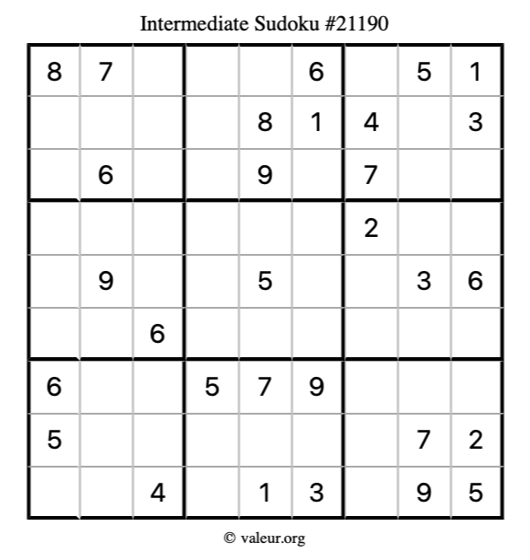 Here is our printable Intermediate Sudoku Puzzle #21190. You are welcome to print a copy for yourself and solve it the old-fashioned way with a pencil and an eraser!
