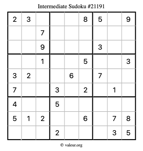 Here is our printable Intermediate Sudoku Puzzle #21191. You are welcome to print a copy for yourself and solve it the old-fashioned way with a pencil and an eraser!