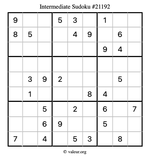 Here is our printable Intermediate Sudoku Puzzle #21192. You are welcome to print a copy for yourself and solve it the old-fashioned way with a pencil and an eraser!