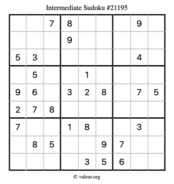 Here is our printable Intermediate Sudoku Puzzle #21195. You are welcome to print a copy for yourself and solve it the old-fashioned way with a pencil and an eraser!
