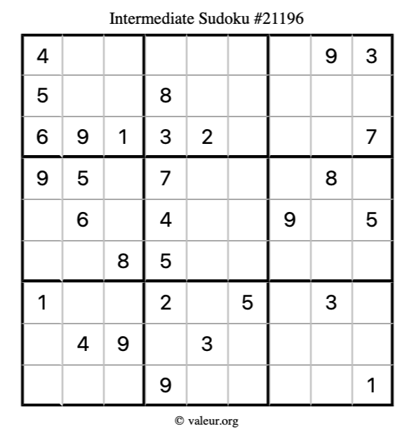 Here is our printable Intermediate Sudoku Puzzle #21196. You are welcome to print a copy for yourself and solve it the old-fashioned way with a pencil and an eraser!