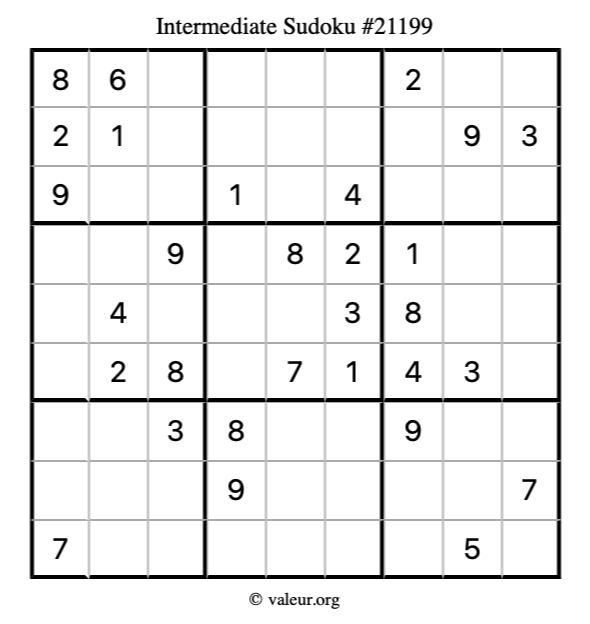 Here is our printable Intermediate Sudoku Puzzle #21199. You are welcome to print a copy for yourself and solve it the old-fashioned way with a pencil and an eraser!