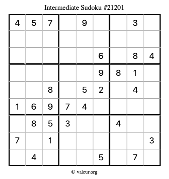 Here is our printable Intermediate Sudoku Puzzle #21201. You are welcome to print a copy for yourself and solve it the old-fashioned way with a pencil and an eraser!