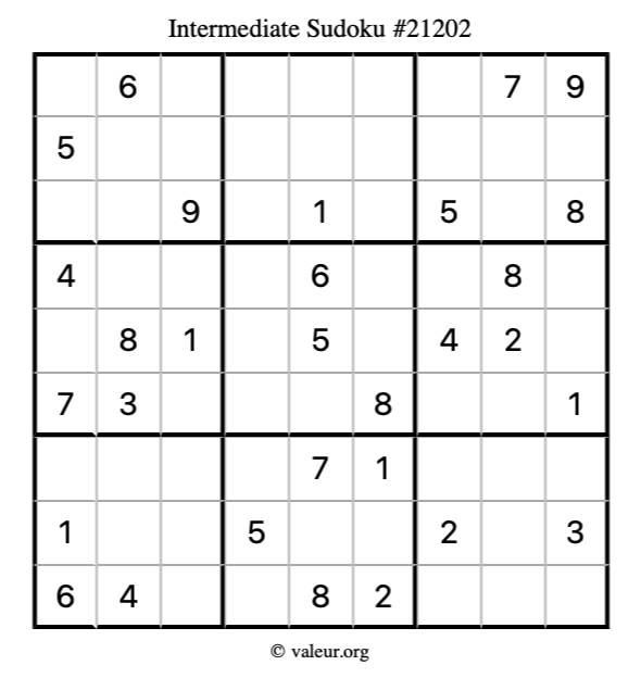 Here is our printable Intermediate Sudoku Puzzle #21202. You are welcome to print a copy for yourself and solve it the old-fashioned way with a pencil and an eraser!